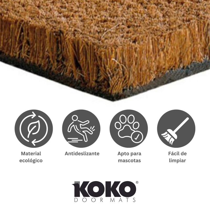 Fabricado en fibra de coco natural y una base de PVC, convirtiendo esta alfombrilla en un producto resistente, duradero y antideslizante. La base de PVC permitirá que te sacudas y restriegues los zapatos  sin tener ningún resbalón, mientras que las fibras de coco secaran la humedad de tus zapatos o zapatillas y eliminaran restos de suciedad y barro.